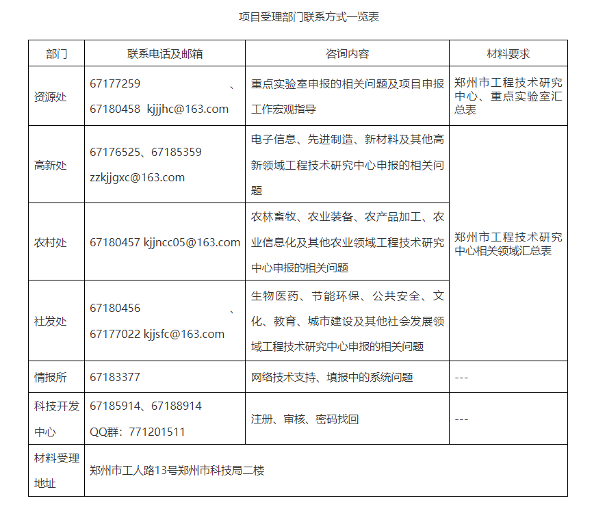 (二)本次申报实行集中申报,由区县(市)科技主管部门统一申报。工程技术研究中心汇总表按所属归口领域报至市科技局相关业务处室及资源处各一份;重点实验室汇总表报资源处一份。各专项业务性问题咨询、项目审查、受理详见“项目受理部门联系方式一览表”。